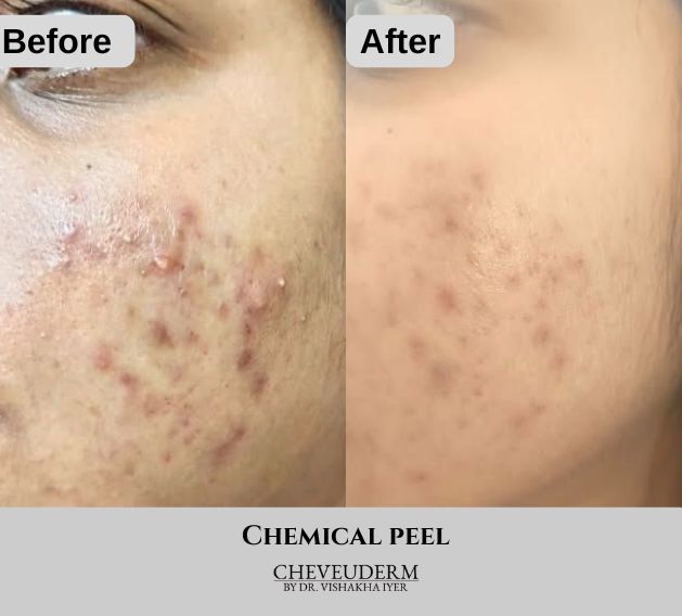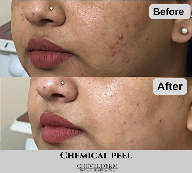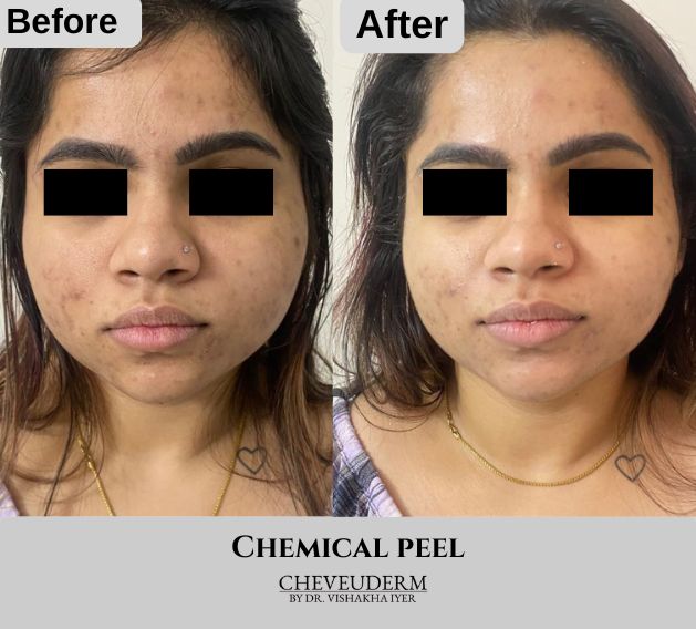 Chemical peel before and after results at Cheveuderm show visible improvement in pigmentation, acne marks, skin texture, and overall radiance — typically noticeable from the first session, with cumulative results across a treatment course. Chemical peel before and after Indian skin shows particularly strong results for post-inflammatory hyperpigmentation and melasma when the correct peel depth is selected.